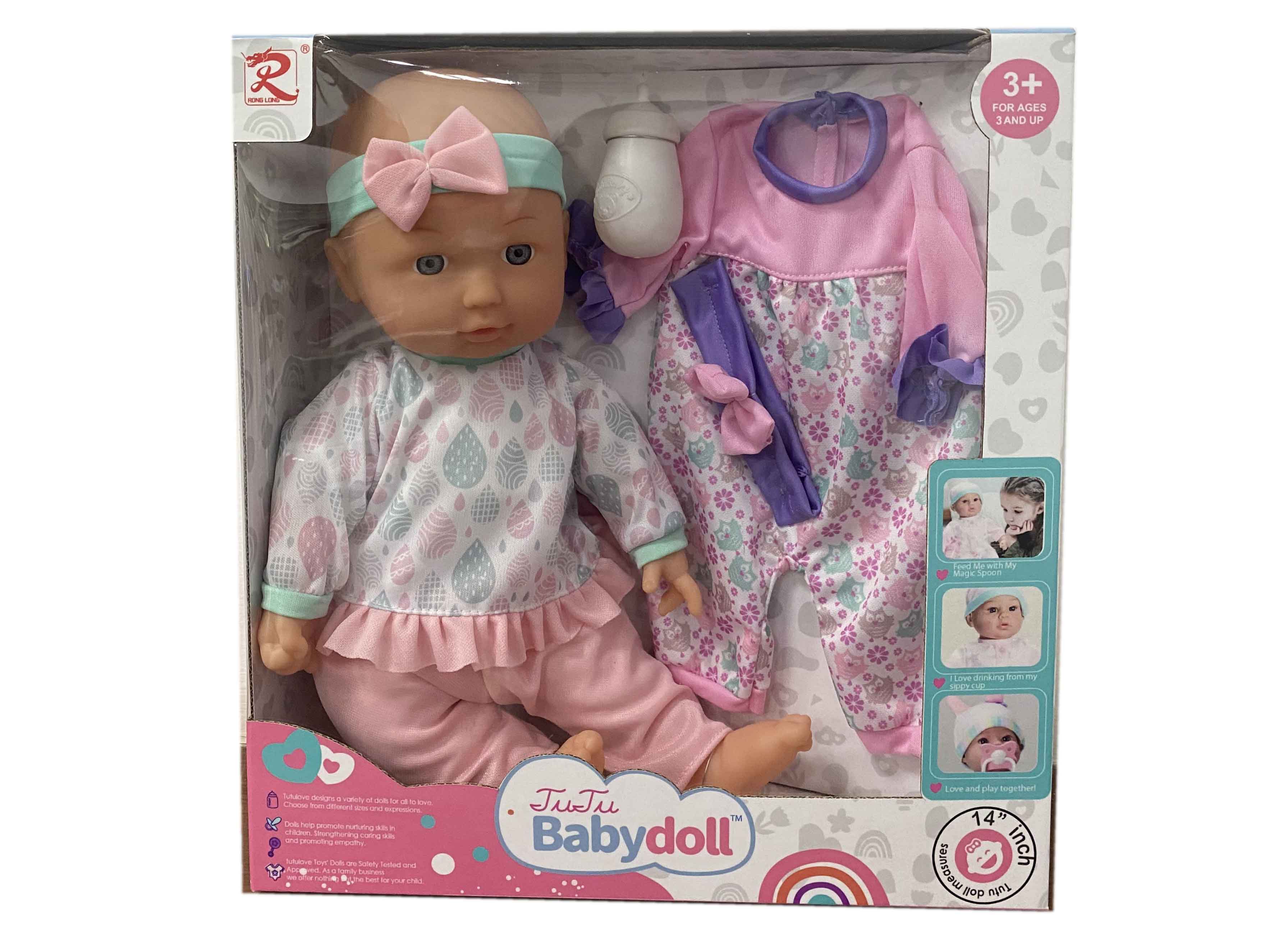 Bring joy to playtime with the Tutu Baby 14-Inch Doll with Accessories in White. This adorable baby doll features a lovely white outfit and comes with fun accessories that make pretend play more engaging and creative.