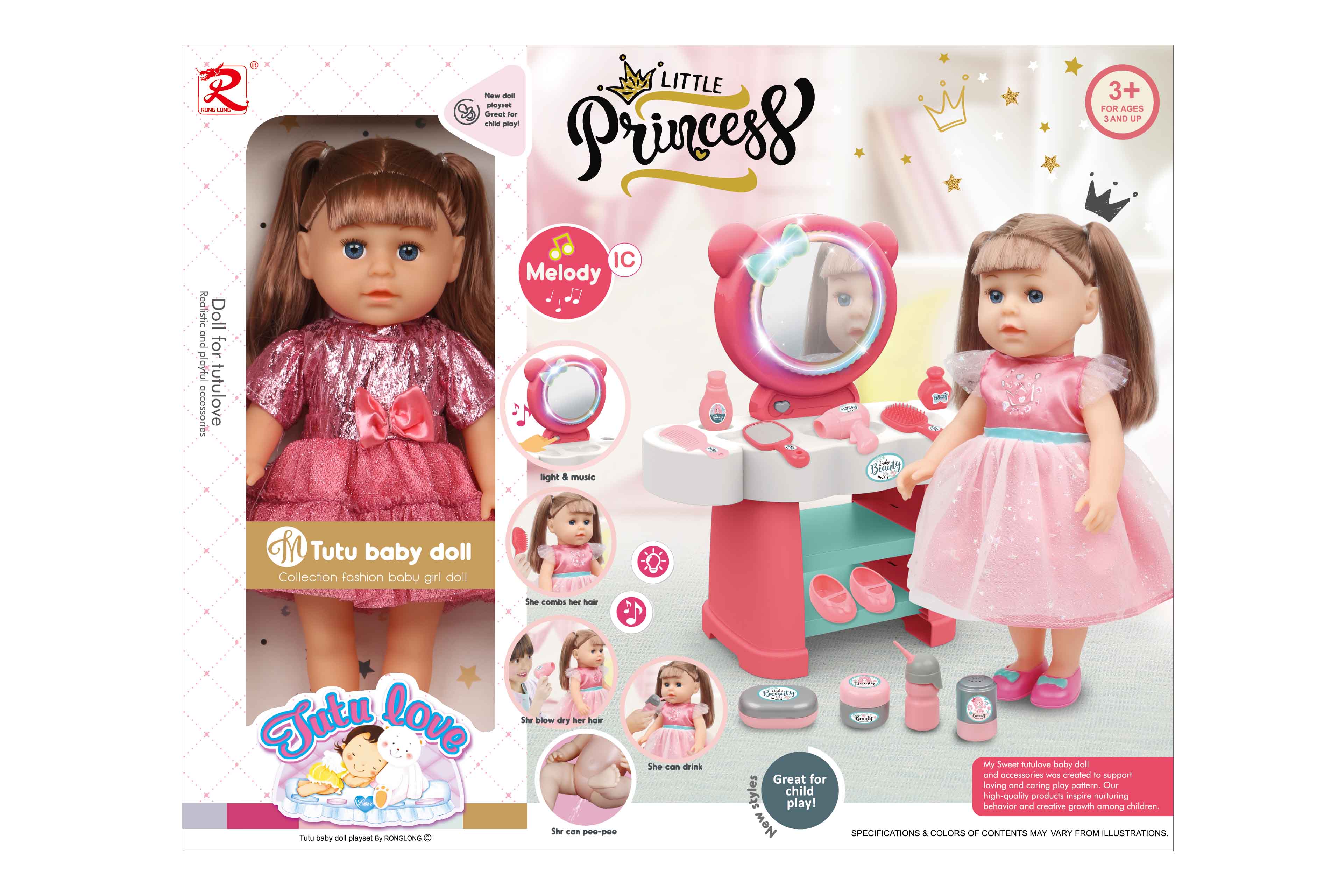 • 14-inch princess doll with shiny pink tutu outfit